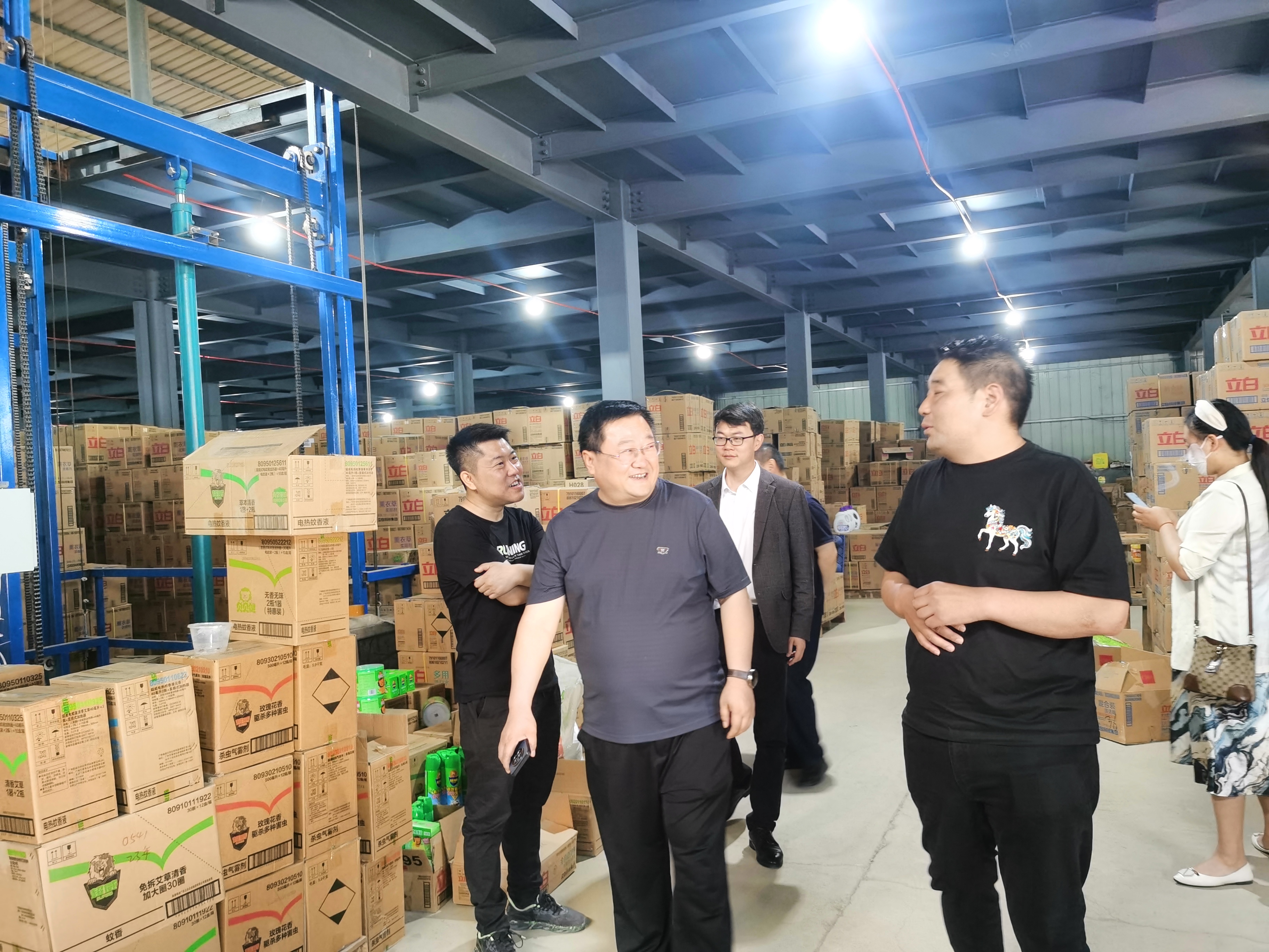 首先考察组深入考察了企业。在南阳市共盈实业有限公司董事长兼总经理吴天转、及其企业相关部门负责人的陪同下,范蠡商学院考察组一行深入考察了电商直播间、商品陈列间、商品仓储室等企业现场。