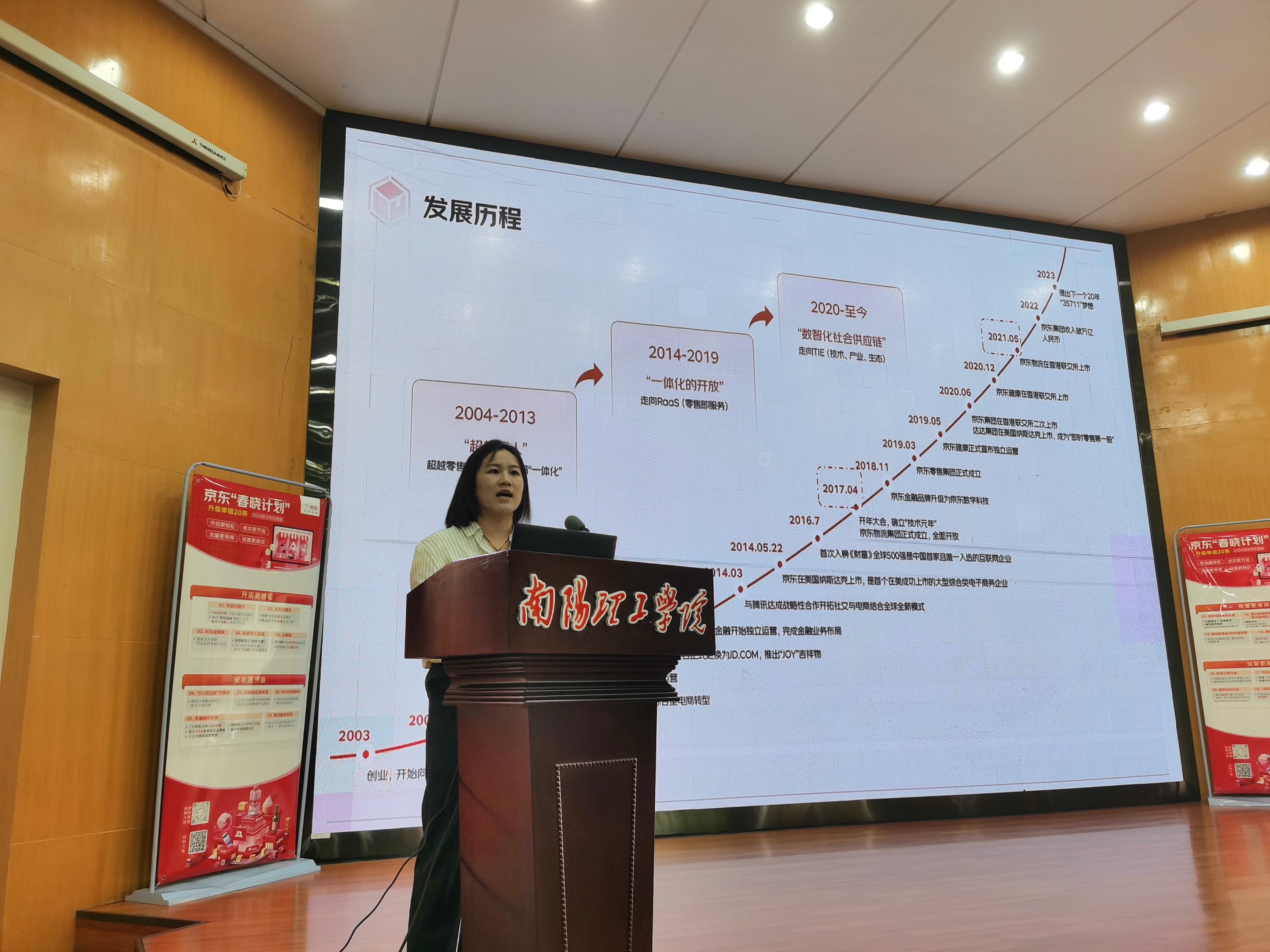 本网讯(特约记者/李浩)5月27日,“京东特色产业带集群中国行·走进南阳暨产业带高质量发展峰会”暨商圣大讲堂第四十一期在我校成功召开。南阳市商务局副局长牛犇、电子商务科科长包阳、电商发展中心主任孙中勋,京东零售产业带中西区总经理罗嘉兴,京东科技(南阳)有限公司总经理王宏喜,京东物流河南省区销售部平台业务负责人王静静,范蠡商学院党委书记闫合占、院长郭永奇、副院长周青浮出席会议,会议由范蠡商学院、南阳理工学院新零售产业学院协办。