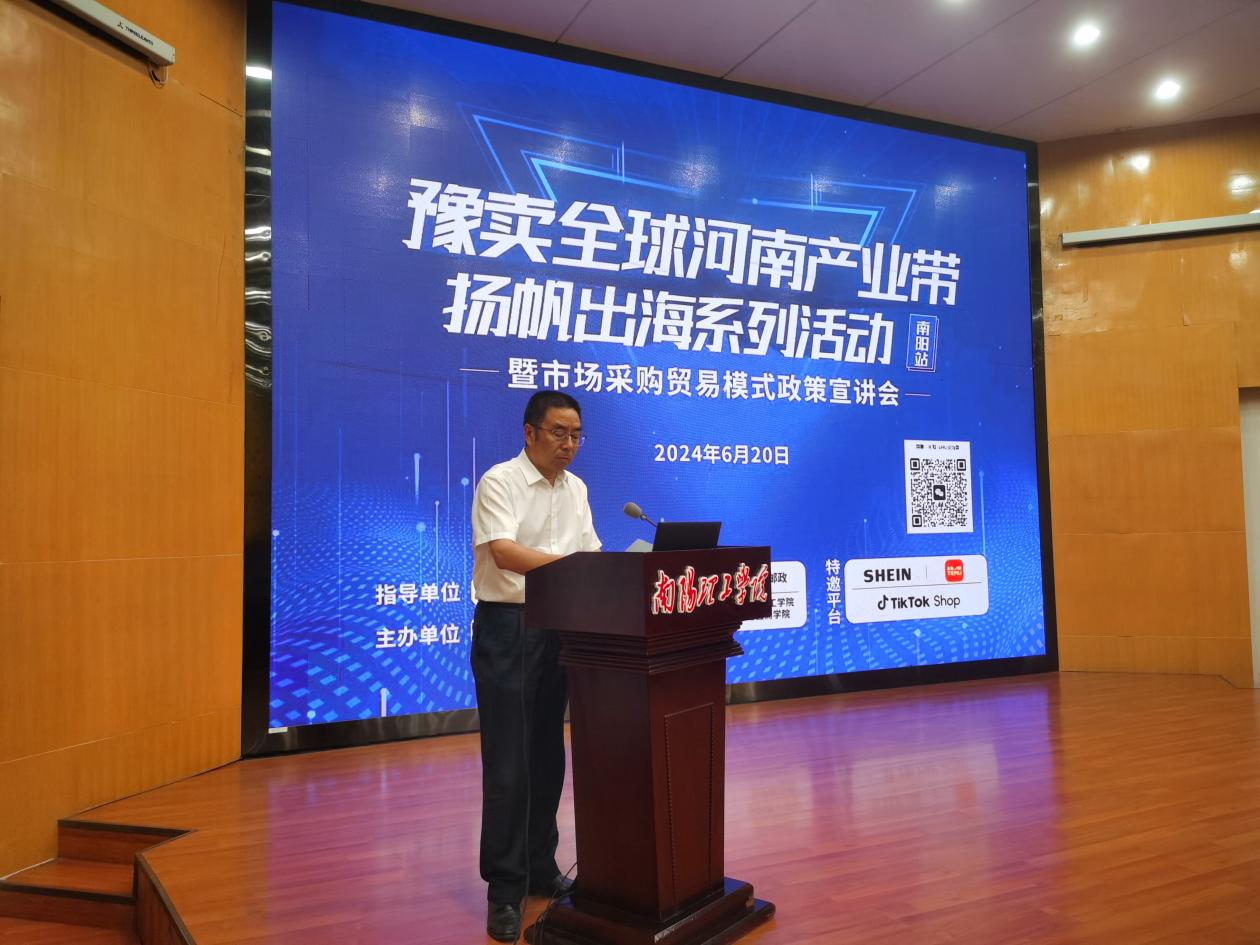 本网讯(特约记者/李浩)6月20日,“豫卖全球河南产业带扬帆出海系列活动(南阳站)暨市场采购贸易模式政策宣讲会”暨商圣大讲堂第四十三期在我校成功召开。南阳市商务局副局长牛犇、范蠡商学院党委书记闫合占、中国邮政集团有限公司南阳分公司副总经理李庆、许昌市对外贸易综合服务中心招商引资部主任张亚辉、豫卖跨境联盟理事长李凯等出席会议,此次活动由范蠡商学院承办。