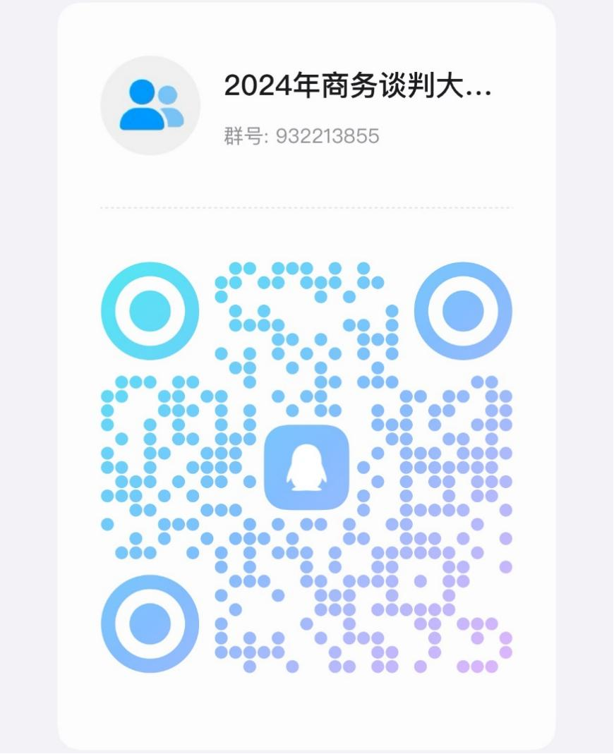 (1)各位参赛学生务必按照以上时间要求提交资料,准备比赛,逾期不交者取消参赛资格。比赛相关信息将在QQ群"2024大学生商务谈判大赛群"通知,已经预报名者烦请扫描下方二维码加入群: